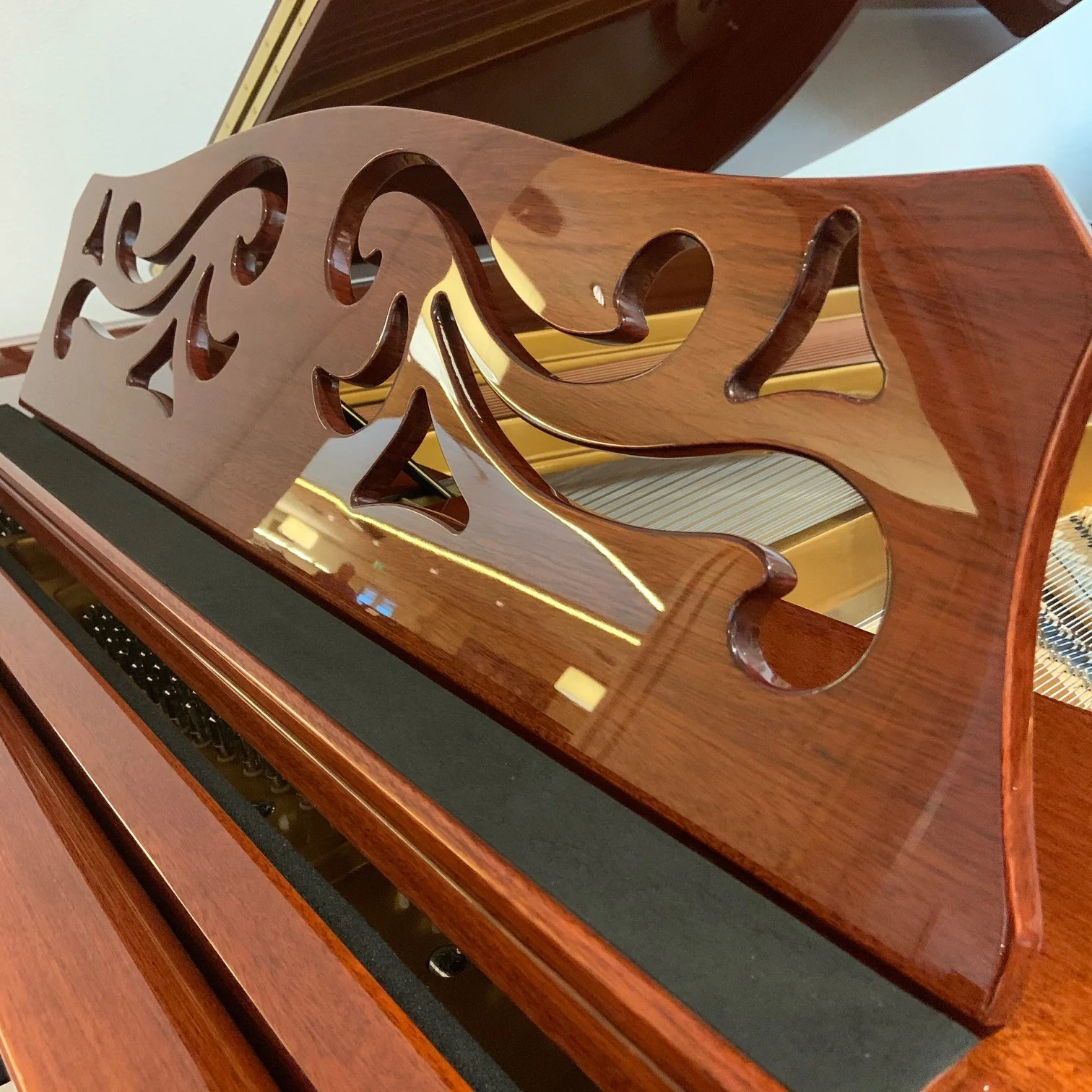 Speciale uitvoering die in kleine oplage is gemaakt. De vleugel is uitgevoerd in noten hoogglans met wortelnoten inleg in het fineer.